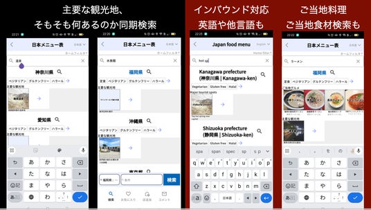 日本を訪れる海外旅行者にも対応するため、英語、中国語、韓国語、スペイン語での検索機能も導入。観光情報やご当地グルメを母国語で確認できる設計となっています