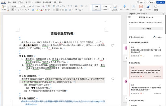 株式会社LegalOn Technologies(本社:東京都渋谷区 代表取締役 執行役員・CEO:角田 望)は、AI法務プラットフォーム「LegalOn Cloud」(https://www.legalon-cloud.com/ )に、「Wordアドイン」機能を実装しました。契約書作成で多用されるMicrosoft Word上でファイルを開きながら「LegalOn Cloud」の契約リスクチェックや法令遵守チェック、校正などの機能が利用可能となり、より効率的な契約レビューをサポートします。