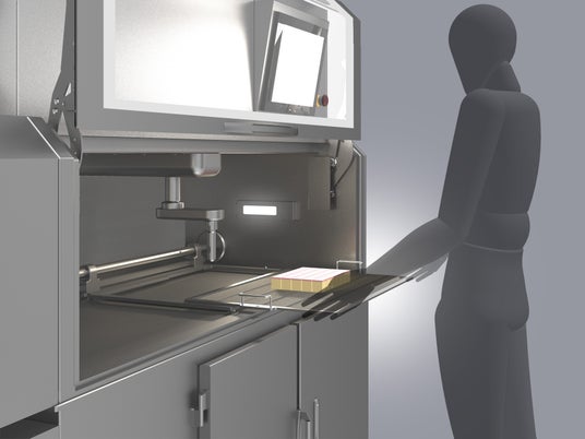 食品専用ウォータージェットカッタは、店舗や厨房などに設置し、パティシェやシェフが使用することを念頭に、省スペースかつ、操作や清掃が簡単に行える装置をコンセプトに開発しました。