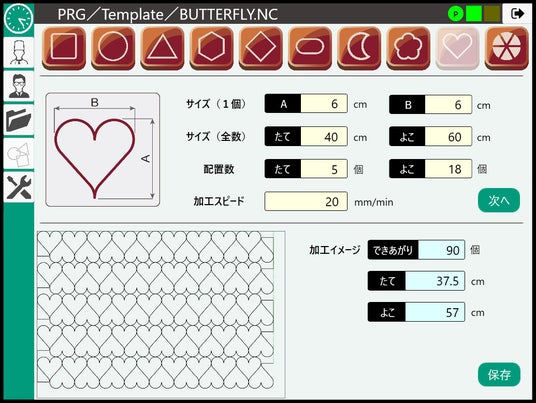 ハート形や星形など10種類の図形が登録されています。図形を選択し、大きさや個数を入力することでカットが可能です。このため、登録されている図形であれば、図形のデータを準備する必要がありません。
