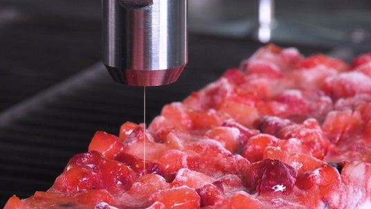 ウォータージェットによる食品のカットは以前より行っており、超音波カッタや回転刃では難しい、自由形状のカットが簡単に綺麗にでき、かつ刃こぼれがないなど、安全面からも水の刃によるカットが評価され、食品業界へも導入されています。また、固い冷凍品から、柔らかい素材まで自由にカットし、効率化とオリジナリティの両立が図れることもウォータージェットの魅力です。
