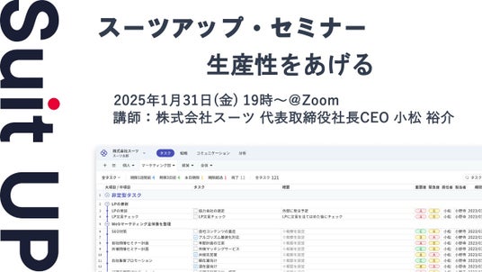株式会社スーツ(所在地:東京都千代田区、代表取締役社長CEO:小松 裕介)は、2025年1月31日(金)19時から、当社代表の小松が講師を務めるスーツアップ・セミナー「生産性をあげる」を無料開催します。