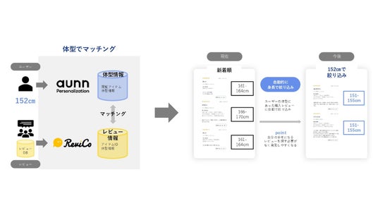 ユーザーの体型や好みを基に、コンテンツをパーソナライズする「aunn Personalization」と、レビューマーケティングプラットフォーム「ReviCo」が連携し、レビューをパーソナライズすることで、ユーザーの購買体験を向上させるため以下の取り組みを実施します。これにより、ユーザーは自分の体型と近い購入者のレビューを探すことなく閲覧することが可能となり、購入の手助けになることが期待できます。