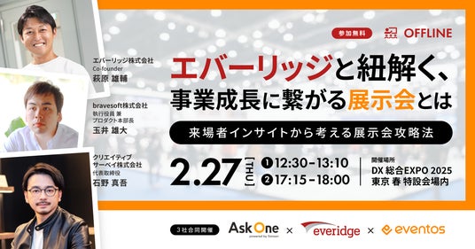 「あしたをオモシロク」の実現を目指すイベンテックカンパニー、bravesoft株式会社(読み:ブレイブソフト、代表取締役:菅澤英司、以下「当社」)は、イベントDXサービス「eventos(イベントス)」と、クリエイティブサーベイ株式会社(以下クリエイティブサーベイ)が提供する「顧客の声を機会に変える」をミッションに、あらゆる顧客接点で営業機会を逃さないマルチチャネルフォーム「Ask One」との連携を発表します。また、「DX 総合EXPO」をはじめとしたエバーリッジ株式会社(以下エバーリッジ)が主催する展示会において本連携の活用を開始し、3社間で連携することで展示会業界における出展者と来場者の新たな体験価値向上に向けた取り組みを開始します。
