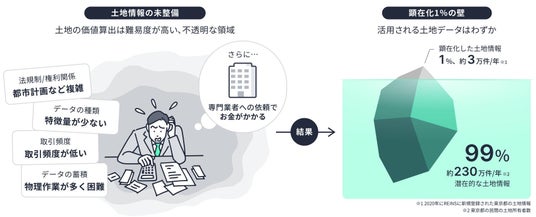 不動産は土地と建物から成り立っていますが、特に土地の価値を算出することは難しく、時間とコストがかかるため、これが大きなボトルネックとなっています。さらに小規模な不動産においては、土地の価値の算定に必要な調査費用がROI(投資利益率)に見合わない場合が多く、土地情報のデータ化が進んでいないのが現状です。