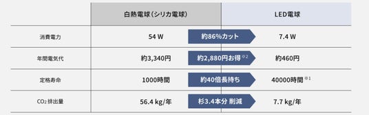 ※3 当社LED電球LDA7L-D-G/S/Z6/F(定格消費電力7.4W、定格寿命40000時間)とJIS規格一般照明用白熱電球60形(定格消費電力54W、定格寿命1000時間)との比較。1日5.5時間、年間2,000時間点灯、使用電力料金(目安単価)31円/kWh(税込)[2022年7月改定]で計算。当社調べ。使用条件により変わることがあります。