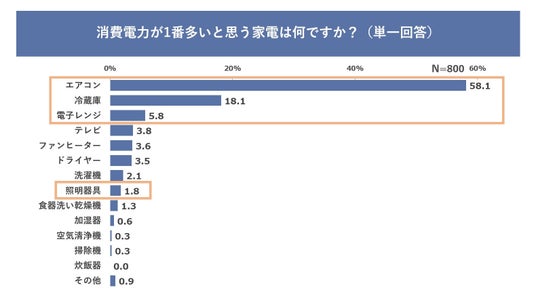 ・消費電力が大きいと思う家電を聞いたところ、1位は58.1%でエアコン、2位は18.1%で冷蔵庫、3位は5.8%で電子レンジという結果に。わずか1.8%の回答となった照明器具は、家庭における家電製品の電力消費割合の約9.3%(冬季)を占め第4位。認識のギャップがあることが判明。