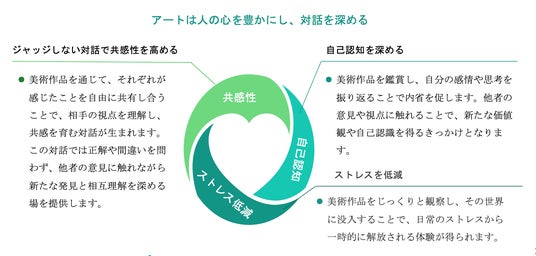 「対話とアートで未来のビジョンを描く」をテーマに、組織診断を基に未来の方向性を共有し、チームで議論を深める対話型プログラムです。美術作品を媒介としたフラットな対話を通じて、感情や価値観を共有し、新たな視点や意味づけを生み出します。また、対話で生まれた未来の理想像を視覚的に表現するビジョンアート創作はチーム内の共通理解と一体感を促進します。これにより、心理的安全性と創造性を高め、組織の結束力を強化します。