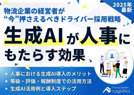 日本最大級の物流コンサルティングファーム 船井総研ロジ株式会社(本社:大阪市中央区、代表:橋本直行、以下「船井総研ロジ」)は、人事業務領域での生成AI活用メリットから、誰でも簡単に導入できるステップまでを分かりやすく解説した無料ダウンロード資料「生成AIが人事にもたらす効果~物流企業の経営者が今押さえるべき、ドライバー採用戦略~」を公開しました。