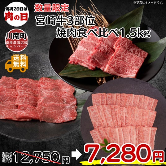 【今だけ送料無料】〈川南町産〉宮崎牛3部位焼肉食べ比べ1.5kgネット価格12,750円