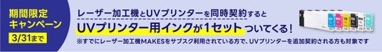 今だけ、レーザー加工機とUVプリンターのサブスクの同時契約でUVプリンター用インクを1セットおまけでプレゼントします。なんと、すでにレーザー加工機MAKESをサブスク利用されている方でUVプリンターを追加契約される方も対象です! ※3月31日までのご契約がキャンペーン対象です。