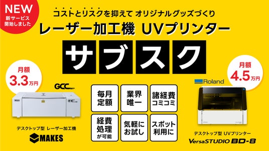 月額定額33,000円(税抜)で利用できるレーザー加工機「MAKES」のサブスクリプションに、新たなアイテムの月額定額45,000円(税抜)で利用できるUVプリンター「BD-8」が新登場しました。