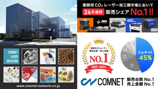 業務用CO2レーザー加工機では、国内で45%のトップシェアを獲得しており、年間販売台数と売上金額も2001年から現在に至るまで、業界内で24年連続で第1位の実績を誇っています。