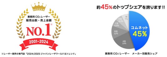業務用CO2レーザーを取り扱っている販売会社は当社以外に国内に12社(メーカーは5社)ありますが、当社の販売実績数は、業界トータル販売数の約45%のシェアを獲得し、年間販売台数・売上金額も調査を始めた2001年~現在に至るまでの間、業界内で24年連続で堂々の第1位の実績を誇ります。