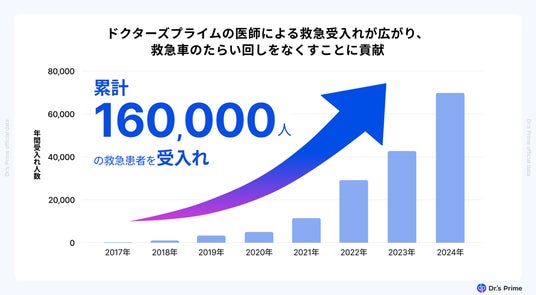 その結果、ドクターズプライムが紹介した医師による救急受入人数は年間67,000人を超え、累計160,000人の救急患者を救うことに貢献しています。