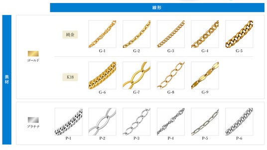 選べるデザイン合計15種(純金チェーン5型、K18チェーン4型、純Ptチェーン1型、Pt850チェーン5型)