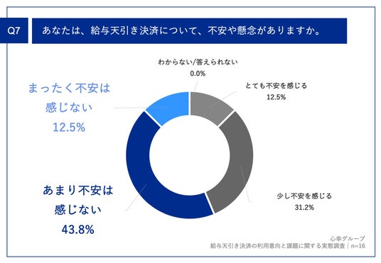 Q4で「あまり利用したくない」「まったく利用したくない」と回答した方に、「Q7.あなたは、給与天引き決済について、不安や懸念がありますか。」(n=16)と質問したところ、「あまり不安は感じない」が43.8%、「まったく不安は感じない」が12.5%という回答となりました。