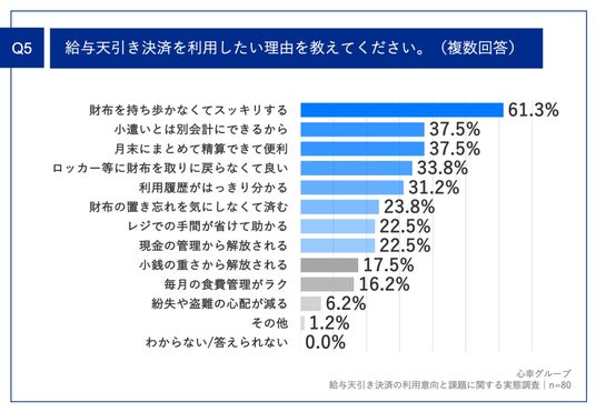 Q4で「ぜひ利用したい」「機会があれば利用したい」と回答した方に、「Q5.給与天引き決済を利用したい理由を教えてください。(複数回答)」(n=80)と質問したところ、「財布を持ち歩かなくてスッキリする」が61.3%、「小遣いとは別会計にできるから」が37.5%、「月末にまとめて精算できて便利」が37.5%という回答となりました。