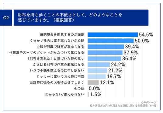 Q1で「とても不便に感じる」「少し不便に感じる」と回答した方に、「Q2.財布を持ち歩くことの不便さとして、どのようなことを感じていますか。(複数回答)」(n=66)と質問したところ、「毎朝現金を用意するのが面倒」が54.5%、「うっかり社内に置き忘れないか心配」が50.0%、「小銭が邪魔で財布が重たくなる」が39.4%という回答となりました。