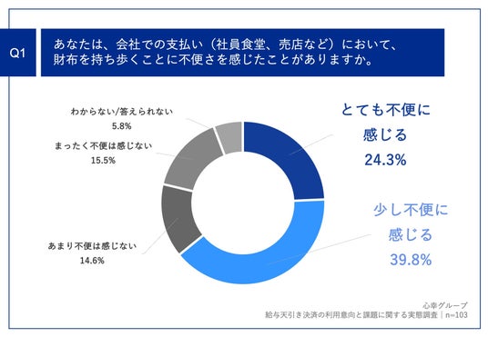 「Q1.あなたは、会社での支払い(社員食堂、売店など)において、財布を持ち歩くことに不便さを感じたことがありますか。」(n=103)と質問したところ、「とても不便に感じる」が24.3%、「少し不便に感じる」が39.8%という回答となりました。