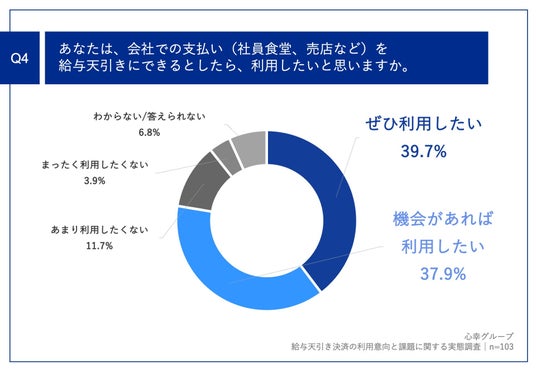 「Q4.あなたは、会社での支払い(社員食堂、売店など)を給与天引きにできるとしたら、利用したいと思いますか。」(n=103)と質問したところ、「ぜひ利用したい」が39.7%、「機会があれば利用したい」が37.9%という回答となりました。