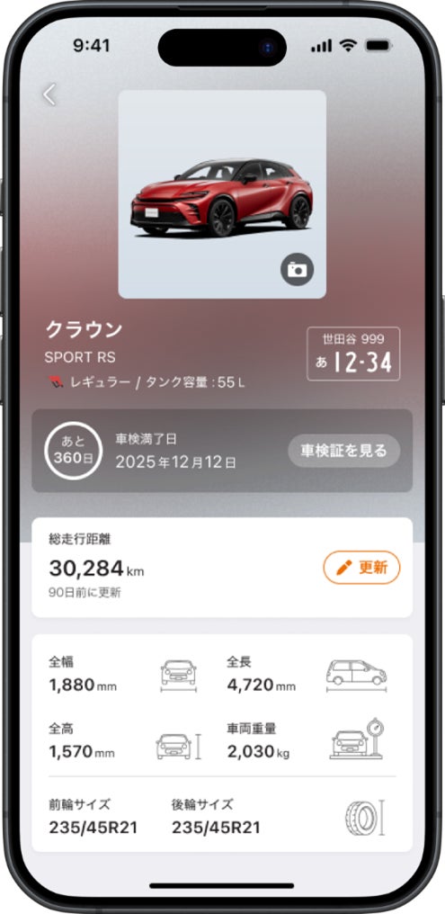 今回の機能アップデートにより、ENEOS公式アプリは、従来の給油アプリから、カーライフを総合的に支えるアプリへと進化します。このアップデートでは、「マイカー機能」が新たに追加されます。自動車検査証か自動車検査証記録事項の二次元コードをカメラでスキャンするだけで、「マイカーページ」が自動的に作成され、車検証の情報に加えて各車両のカタログ情報も取り込み、愛車の情報を一元管理できます。