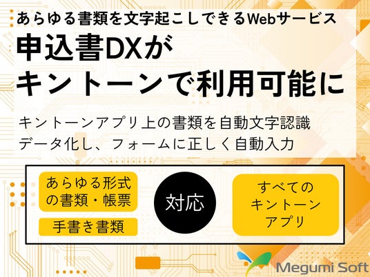 株式会社めぐみソフト(本社:東京都港区、代表取締役:中庄谷 栄太郎)は、入居申込書をはじめとしたあらゆる形式の書類のデータ入力作業を半自動化できるWebサービス『申込書DX』のキントーン連携プラグインを提供開始しました。キントーンと『申込書DX』を連携することで、キントーンにアップロードされた書類を自動文字認識し、ワンクリックでキントーンアプリへ自動入力できるようになります。