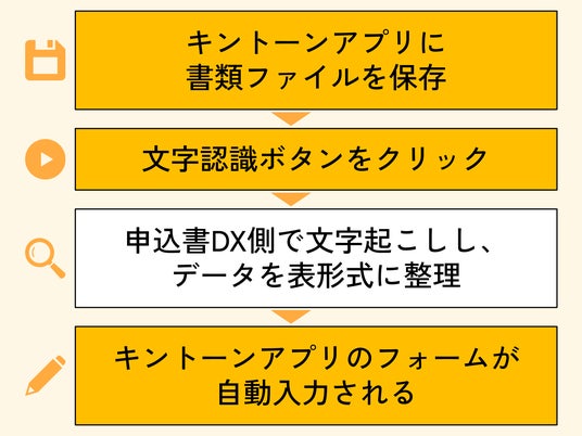 キントーンアプリに書類ファイルを保存→文字認識ボタンをクリック→申込書DX側で文字起こしし、データを表形式に整理→キントーンアプリのフォームが自動入力される