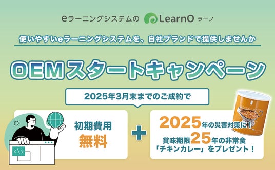Mogic株式会社(本社:東京都練馬区、代表取締役:山根 陽一、以下 Mogic)は、eラーニングシステム「LearnO(ラーノ)」のOEM/ライトOEMの初期費用が無料になる「OEMスタートキャンペーン」を実施します。2025年3月末までにご成約いただいた企業様は、OEMの初期費用が無料となるほか、2025年の災害対策として最適な、賞味期限25年の非常食、「防災セレクトショップ・セイショップ」の「チキンカレー」をプレゼントいたします。