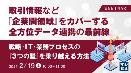 DXでつながる社会の未来を切り拓く 株式会社テクノスジャパン(本社:東京都新宿区、代表取締役 社長執行役員:吉岡 隆、証券コード:3666、以下「テクノスジャパン」)は、株式会社データ・アプリケーション(本社:東京都中央区、代表取締役 社長執行役員:安原 武志、スタンダード市場:3848、以下「データ・アプリケーション」)と共催で、「取引情報など『企業間領域』をカバーする全方位データ連携の最前線 ~戦略・IT・業務プロセスの『3つの壁』を乗り越える方法~」と題したWebセミナーを2025年2月19日に開催いたします。本セミナーでは、最新のITトレンドや動向から実践的アプローチまでを幅広くご紹介し、企業が抱えるデータ連携課題の解決策を提示します。