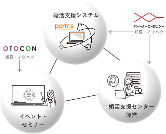 当社は官民一体となって、地方創生や少子化対策を行うことが持続可能な社会の実現につながると考え、当社結婚相談所の有する知見やノウハウを可能な限り、地方の活性化のために活かしていただければと考えております。このため、当社結婚相談所を支える独自開発のマッチングシステムと同等程度の機能を有する「parms」を多くの地方自治体に提供させていただいております。また、これに加えて近年では、婚活支援センターの運営や各種イベント・セミナーの受託も行っております(地方自治体向け3Dオペレーション)。