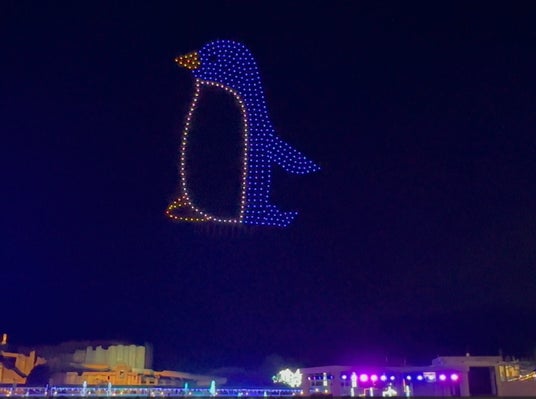 ラグーナ園内のイルミネーションとコラボした500機のドローンショーでは、ペンギン、サメなど海の生物や、園内にある観覧車やお城などを、最新技術のドローンで冬の夜空に描き、ラグーナテンボス・ラグナシアならではショーを演出しました。特に最後の「ラグーナテンボス」の文字の演出部分では、園内から歓声が上がり、会場に一体感が生まれました。