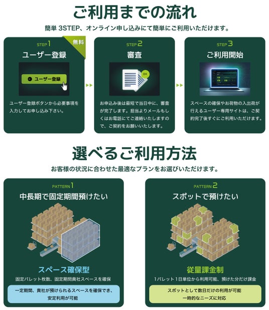 昨年11月より開始しているスペース確保型に加え、今回開始する従量課金プランでは、1パレット単位で1日からの入出荷依頼が可能であり、冷凍貨物の短期間での保管先をお探しの方を含む様々な方のニーズに対応できます。