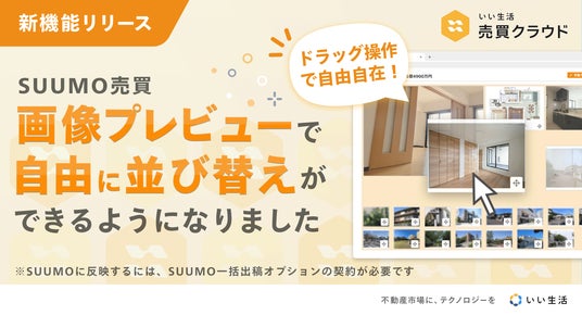 不動産業務を網羅するバーティカルSaaSと業務効率を推進するBPaaS(※1)で不動産市場のDXを推進する株式会社いい生活(東京都港区、代表取締役社長 CEO:前野 善一、東証スタンダード:3796、以下:いい生活)は、「いい生活売買クラウド One」の一括出稿サービスをアップデートしたことをお知らせします。この度のアップデートで、不動産ポータルサイトSUUMOに一括出稿する画像を、プレビュー画面でエンドユーザーに適した並び順に変更できます。