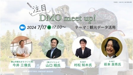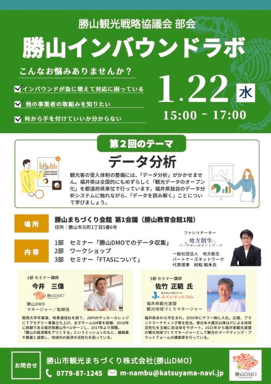 ●「注目 DMO meet up!」第1回の継続事例第1回ゲスト勝山市観光まちづくりの今井三偉取締役/マネージャーは、注目DMO meet up!を機に勝山インバウンドラボを創設。1月22日開催の第2回「勝山インバウンドラボ」では(公社)福井県観光連盟の佐竹正範氏と「勝山DMOでのデータ収集」をテーマに講演、地方創生パートナーズネットワーク代表理事の村松知木がファシリテイターを務めました。今後もこのようなオンライン/オフラインのイベント開催を通じて、地方創生に寄与する取り組みを継続していきます。