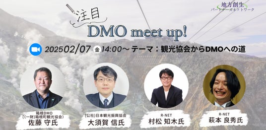 (一社)地方創生パートナーズネットワーク(代表理事:村松知木)は、2月7日にオンラインイベント「注目 DMO meet up!」を開催いたします。第5回となる今回は(一財)箱根町観光協会(箱根DMO)専務理事の佐藤守氏、(公社)日本観光振興協会事業推進グループの大須賀信氏を招いて、「観光協会からDMOへの道」というテーマで実施します。