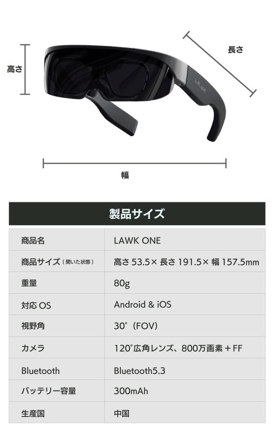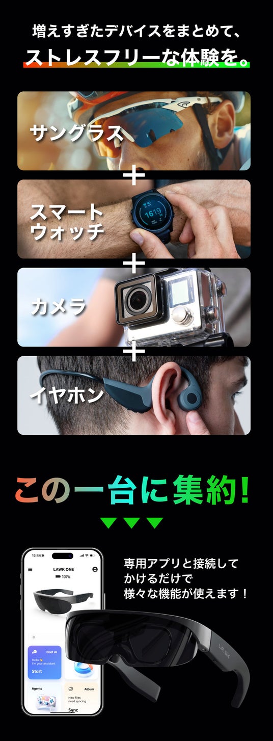 LAWK ONEは現代の増えすぎたデバイス(イヤホン、スマートウォッチなど)機能をひとまとめにし、ストレスフリーなARグラス体験を可能としました。
