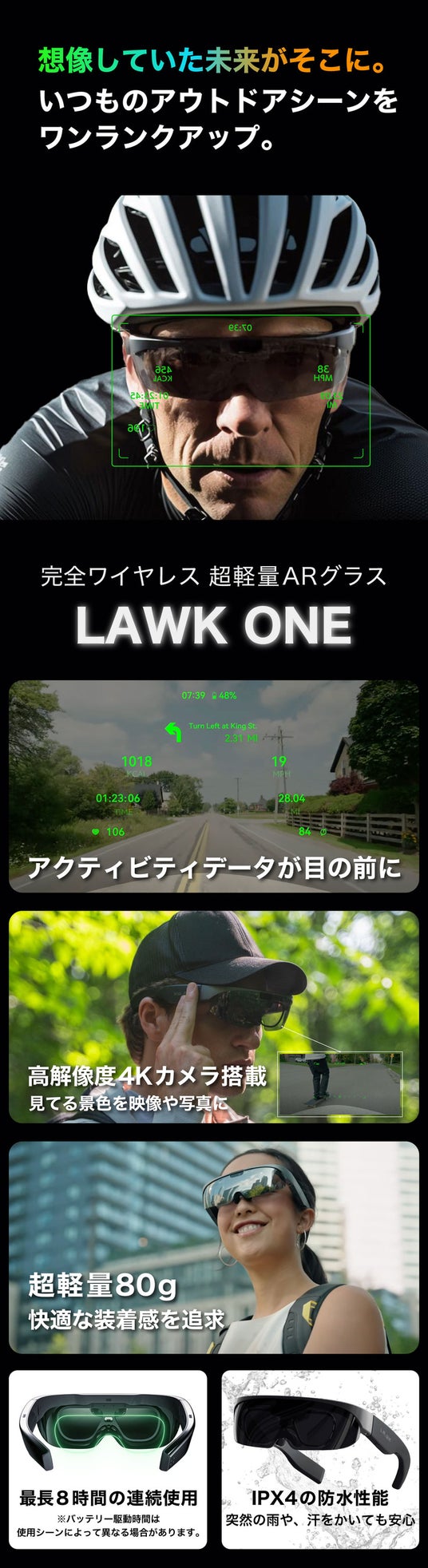 アウトドアで使用するサングラスがARグラス・LAWK ONEに進化し、いつもの視界にナビや通知、測定データがリアルタイムで表示されます。