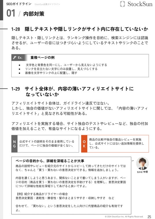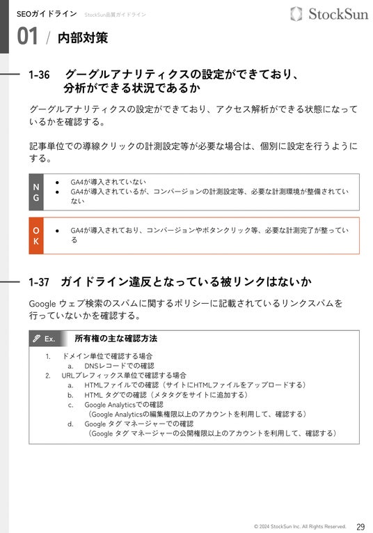 SEOの知識がない新メンバーのトレーニングや、社内での対応基準の共有に最適。SEO施策の標準化を図るための指針として活用いただけます。