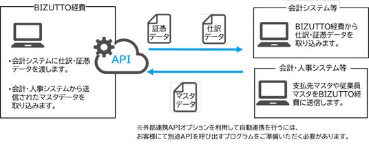 BIZUTTO経費と他システム間でデータの出力や取り込みを行う外部連携API機能を追加しました。これにより、BIZUTTO経費から会計システムへの仕訳・証憑データの出力や、会計システムや人事システムからBIZUTTO経費への各種マスタデータの受け取りを自動で行えるようになりました。