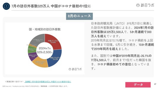 - 7月の訪日外客数329万人 中国がコロナ後初の1位に