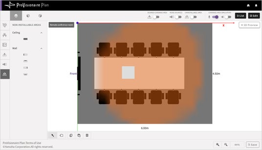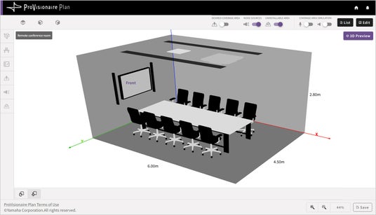 『ProVisionaire Plan』は、音響設備を提案する法人・個人のためのWebブラウザベースのソフトウェアです。機器や部屋の環境といった専門知識を必要とする音響設備の提案について、簡単な設置先の情報を入力するだけで、提案書のベースとなるマイクロフォンやスピーカーの機器リストやレイアウト図の出力が行えます。