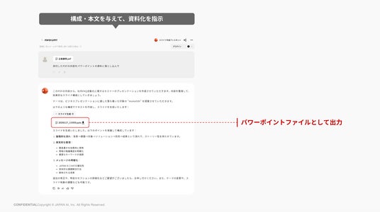 JAPAN AI株式会社(本社:東京都新宿区、代表取締役社長:工藤 智昭、以下JAPAN AI)は、自律型AIエージェント「JAPAN AI AGENT」のラインナップとして、スライド資料の作成を補助するAIエージェント「スライド作成アシスタント」の提供を開始したことをお知らせします。
