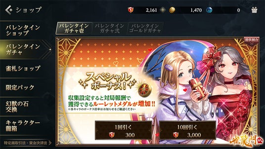また、「メイファ:バレンタインver」、「メイシン:バレンタインver」、「一条 凪:バレンタインver」、「高柳 舞:バレンタインver」以外の「メイファ」、「メイシン」、「一条 凪」、「高柳 舞」シリーズのアバターを収集設定した場合、対局報酬で獲得できるルーレットメダルの数は通常の2倍に増加します。