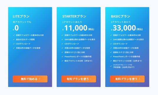 現在提供中の「STARTERプラン」で好評のカテゴリ別分析機能やPowerPointレポート自動分析機能に加え、「BASICプラン」のみ、競合分析機能の登録件数の拡大と、今後は投稿予約機能の実装を予定しています。