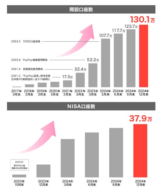 PayPay証券株式会社(東京都千代田区、代表取締役社長執行役員CEO:番所 健児、以下PayPay証券)は、2024年12月31日時点で、証券口座の開設数が130.1万口座を突破しました。