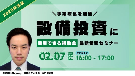 この度、補助金クラウドを運営する株式会社Stayway(本社:大阪府大阪市、代表取締役:佐藤淳、以下「Stayway」)は、事業会社が補助金を活用し設備投資を促進するための「【2025年注目】事業成長を加速!設備投資に活用できる補助金最新情報セミナー」を開催いたします。