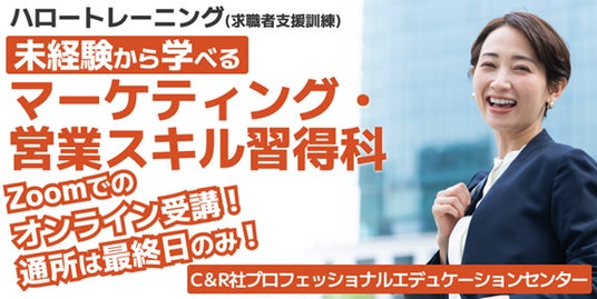 株式会社クリーク・アンド・リバー社(C&R社)は、厚生労働省の認定を受け、3月19日(水)より、「未経験から学べるマーケティング・営業スキル習得科 B-13」(3月19日開講・3か月訓練)の受講生を募集します。こちらのコースでは、プロフェッショナル・エージェンシー事業を展開するC&R社の豊富な営業ノウハウを取り入れ、今の時代に合わせた戦略的な営業スキルを身につけ、様々な業界で活躍する人材の育成をめざします。