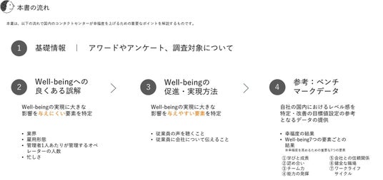 本書は、左記の流れで国内のコンタクトセンターが幸福度・Well-beingを促進、実現していくための重要なポイントを解説しています。