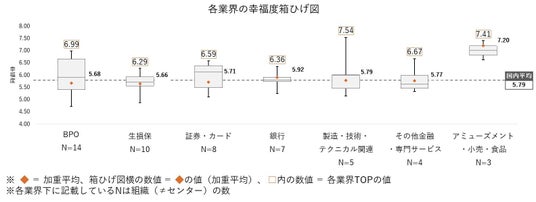 それぞれの業界が提供する業務の性質などによって幸福度が上がりにくい業界があるのかを分析した結果、平均値は「アミューズメント・小売り・食品」を除き大きく変わらず、さらにどの業界でもTOPの組織は国内平均の幸福度を大きく上回っていることがわかりました。